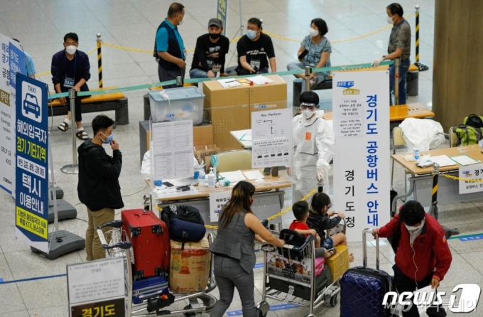 | (인천공항=뉴스1) 안은나 기자 = 12일 인천국제공항에서 해외 입국자들이 별도로 이용할 교통수단 안내를 받고 있다. 오는 13일부터 방역강화 대상 국가에서 입국하는 모든 외국인은 입국 때 출발일 기준 48시간 이내에 발급한 유전자 증폭검사(PCR) 음성 확인서를 의무적으로 제출해야 한다. 2020.7.12/뉴스1 |